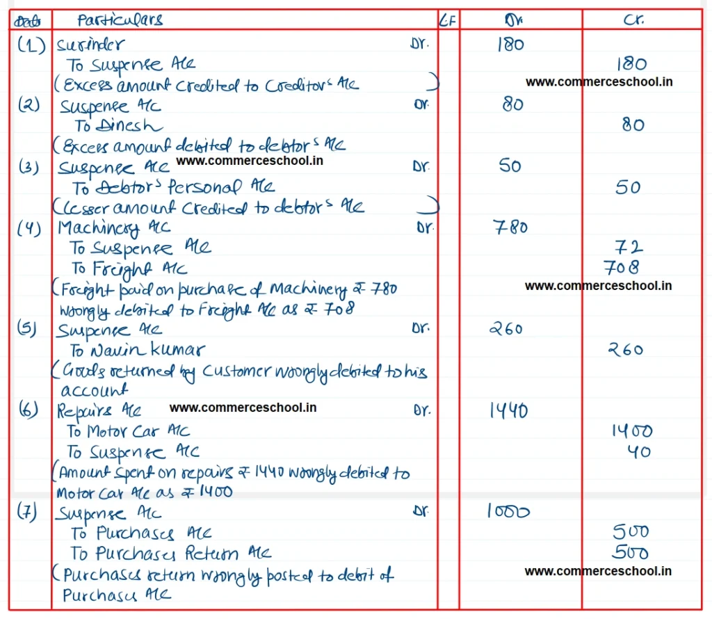 (1) In item no. 1, Purchase Return A/c will be debited and Suspense A/c will be credited.