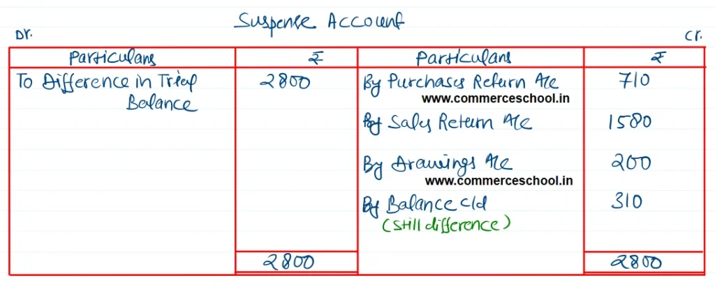 Q. 30. A Book-keeper finds that the totals of his trial balance disagree by ₹ 2,800. He temporarily debits a Suspense Account with this amount and closes the books. On an examination of the books, the following errors are discovered:-