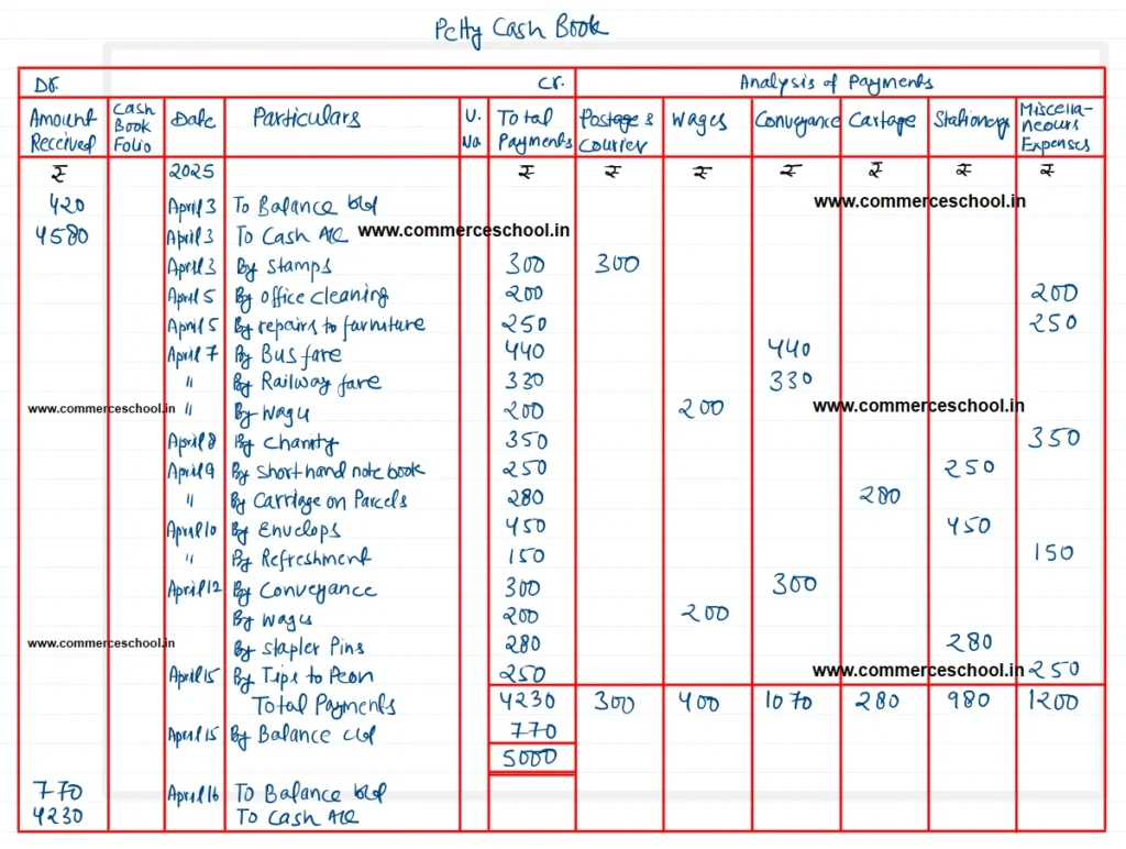 | April 7 | Paid bus fare ₹ 440, railway fare ₹ 330, wages ₹ 200. |
