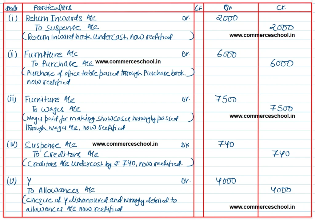Q. 35. During the course of an accounting year, an Accountant found a difference in the trial balance. He puts this difference in a newly opened suspense account. Subsequently, he located the following errors in his books of account: