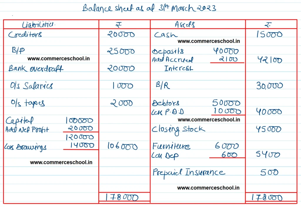Hint: Interest receivable ₹ 2,100 will be shown on the Cr. side of P & L A/c and will also be added in the Deposits on the Assets side.