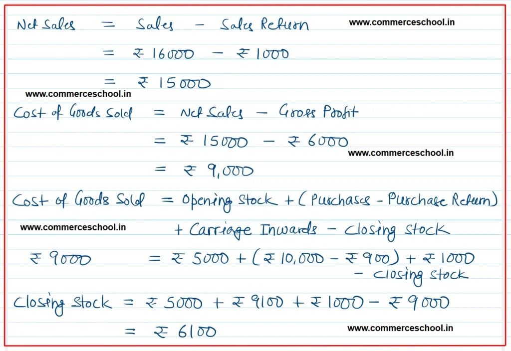 Opening Stock ₹ 5,000; Sales ₹ 16,000; Carriage Inwards ₹ 1,000; Sales Returns ₹ 1,000; Gross Profit ₹ 6,000; Purchases ₹ 10,000; Purchase Returns ₹ 900.