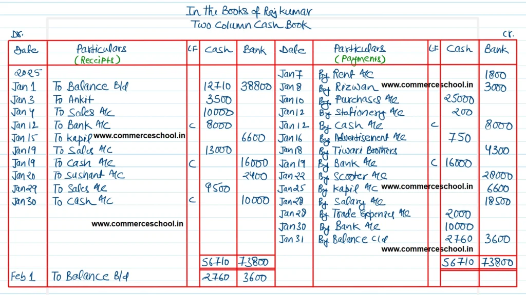 Write up Cash Book of Raj Kumar with Cash and Bank Columns from the following transactions:-