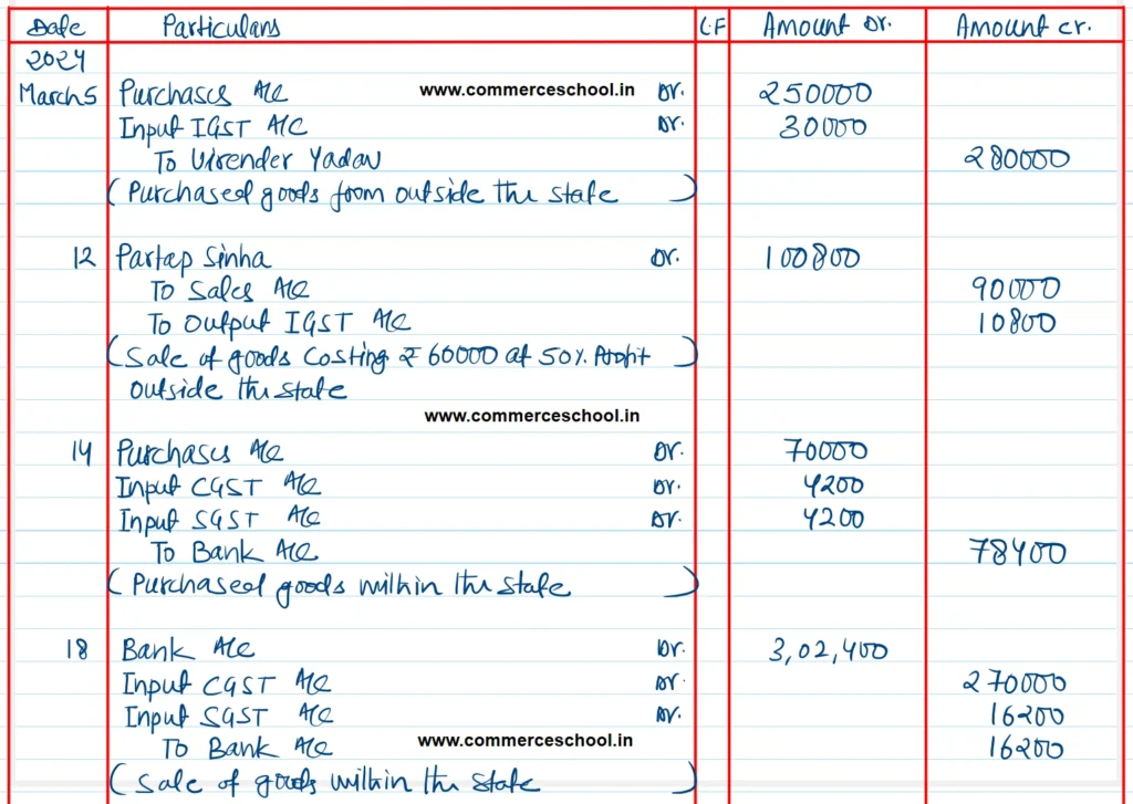 | March 5 | Purchased goods for ₹ 2,50,000 from Virender Yadav of Patna (Bihar) |
