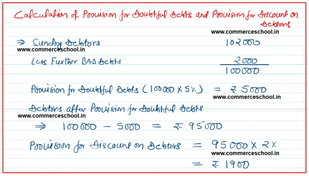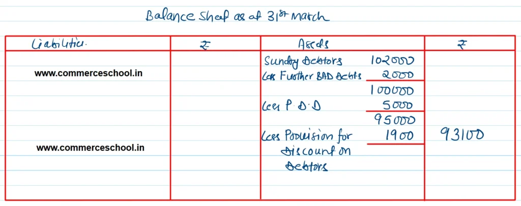 [Ans. Net amount shown on Dr. side of P & L A/c for Bad debts & Provision for Doubtful Debts ₹ 5,000, and for Provision for Discount ₹ 1,900. Balance Sheet ₹ 93,100.]