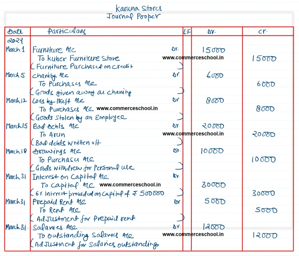 | March 12 | Goods worth ₹ 8,000 and cash ₹ 4,000 were stolen by an employee. |