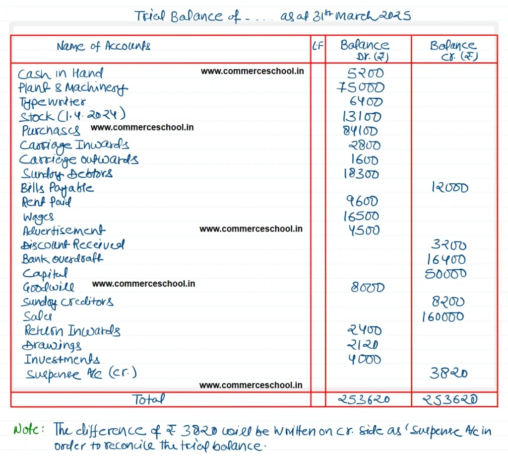 Therefore, in order to reconcile the Trial Balance ₹ 3,820 will be written on Cr. side as ‘Suspense Account’.]