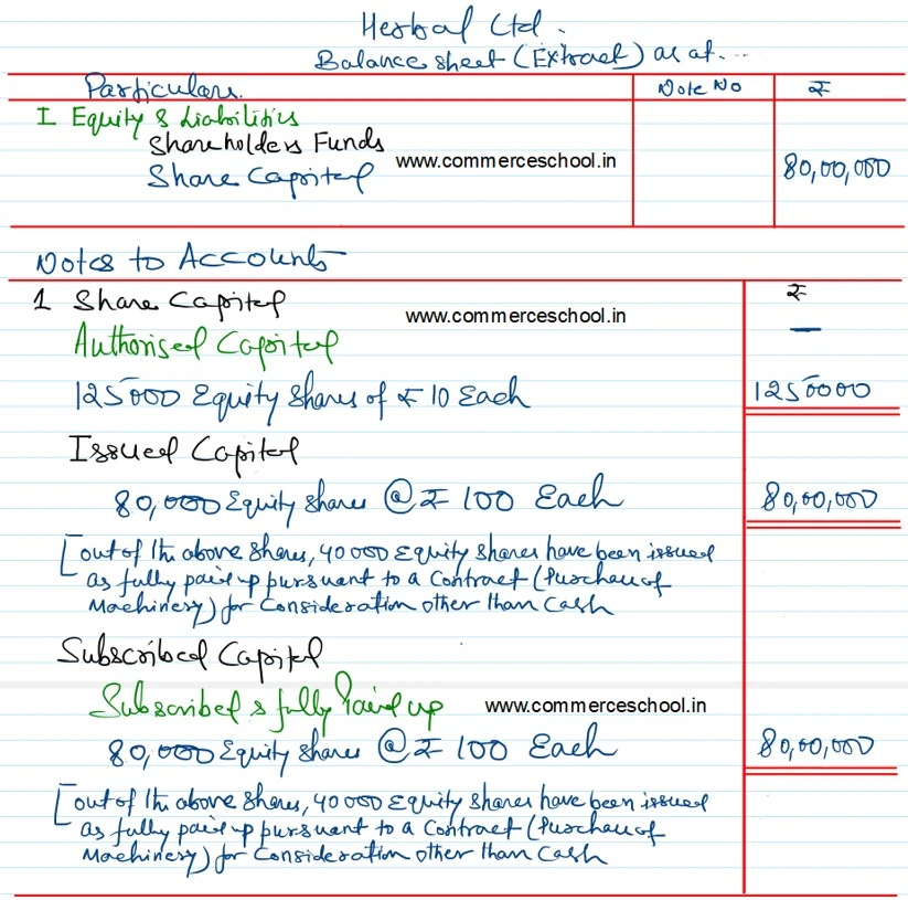 Herbal Ltd. is registered with an authorised capital of ₹ 12,50,000 divided into 1,25,000 Equity Shares of ₹ 10 each. It has an existing issued and fully paid-up Equity Share Capital of ₹ 4,00,000. It purchased a machine for ₹ 4,00,000 and issued 40,000 fully paid Equity Shares to the vendor.
