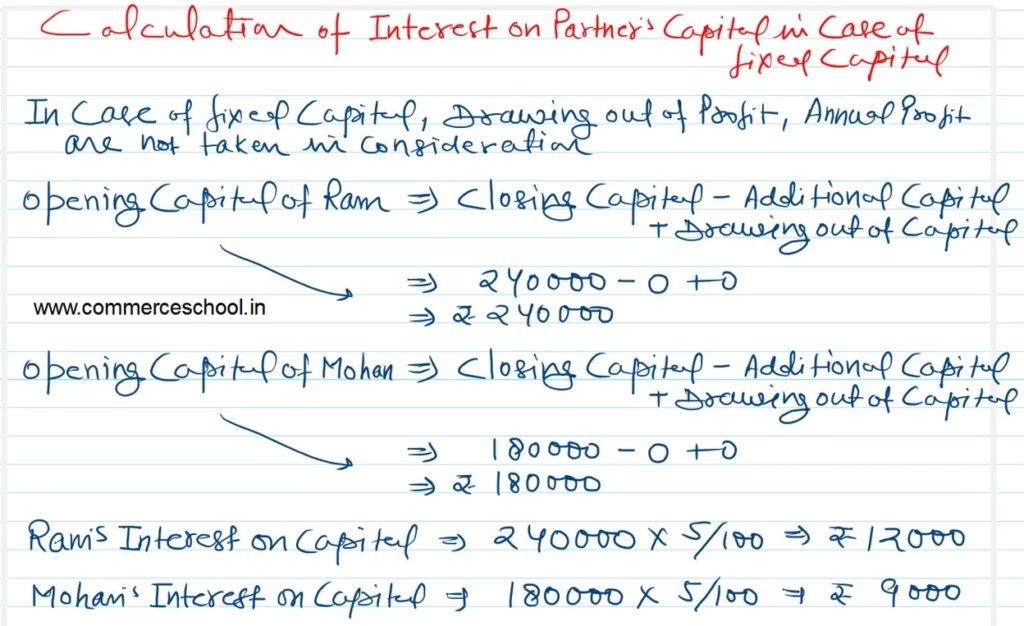 Ram and Mohan are partners and their capitals for the year ended 31st March 2023 were ₹ 2,40,000 and ₹ 1,80,000 respectively. During the year 2022-23, Ram’s and Mohan’s drawings were ₹ 40,000 and ₹ 60,000 respectively. Profit (before charging interest on capital) during the year was ₹ 1,60,000. Calculate interest on capital @ 5% p.a. for the year ended 31st March 2023.