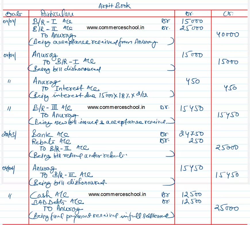 Arpit drew two bill of exchange on 1st January, 2023 for ₹ 15,000 and ₹ 25,000. The Bill of Exchange for ₹ 15,000 is for two months while the Bill of Exchange for ₹ 25,000 is for three months. These bills are accepted by Anurag on 4th March, 2023. Anurag requests Arpit to renew the first bill with interest at 18% p.a. for the period of two months. Arpit agreed to this proposal. On 20th March, 2023, Anurag retires the acceptance for ₹ 25,000, the interest rebate, i.e., discount being ₹ 250. Before the due date of the renewed bill, Anuarg became insolvent and only 50 paise in a rupee could be recovered from the estate. You are required to give the Journal entries in the books of Arpit.