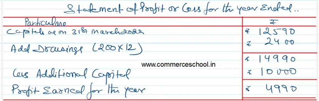 During the year, he estimated his drawings to be ₹ 2,400. You are required to prepare the statement, showing profit/loss for the year, after writing off 10% for depreciation on furniture and fittings.