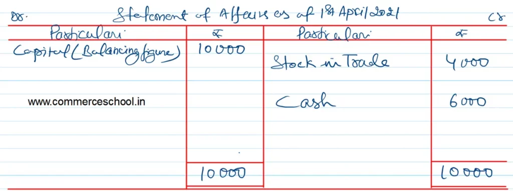 Prashad statrted business on 1st April, 2021 with Cash ₹ 6,000 paid into bank but stocks valued at ₹ 4,000.