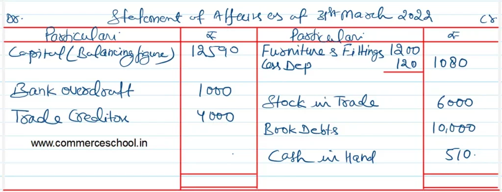 Book Debts ₹ 10,000; Cash in Hand ₹ 510; Stock-in-Trade (Estimated) ₹ 6,000; Furniture and Fittings ₹ 1,200; Trade Creditors ₹ 4,000; Bank Overdraft ₹ 1,000.