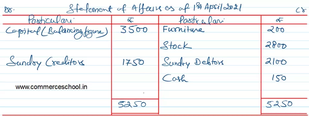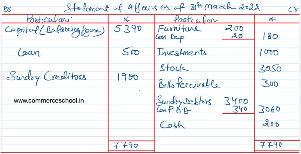 | Furniture Stock Sundry Debtors Cash Sundry Creditors Bills Receivable Loan Investments | 200 2,800 2,100 150 1,750 – – – | 200 3,050 3,400 200 1,900 300 500 1,000 |