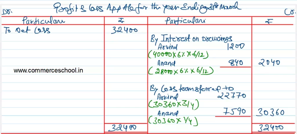 [Ans: (i) Interest on drawings: Arvind – ₹ 12,00, Anand ₹ 840 (ii) Share of Loss : Arvind – ₹ 22,770, and Anand – ₹ 7,590)