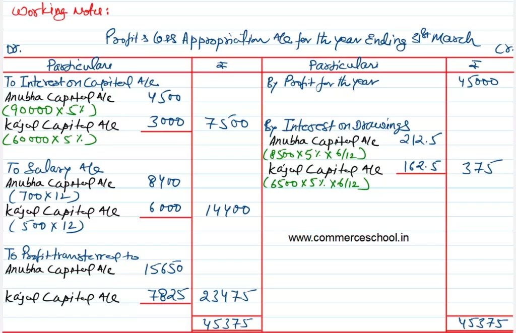 Anubha and Kajal are partners of a firm sharing profits and losses in the ratio of 2 : 1. Their capital, were ₹ 90,000 and ₹ 60,000. The profit during the year were ₹ 45,000. According to partnership deed, both partners are allowed salary, ₹ 700 per month to Anubha and ₹ 500 per month to Kajal. Interest allowed on capital @ 5% p.a. The drawings during the year were ₹ 8,500 for Anubha and ₹ 6,500 for Kajal. Interest is to be charged @ 5% p.a. on drawings. Prepare partners capital accounts, assuming that the capital account are fluctuating.