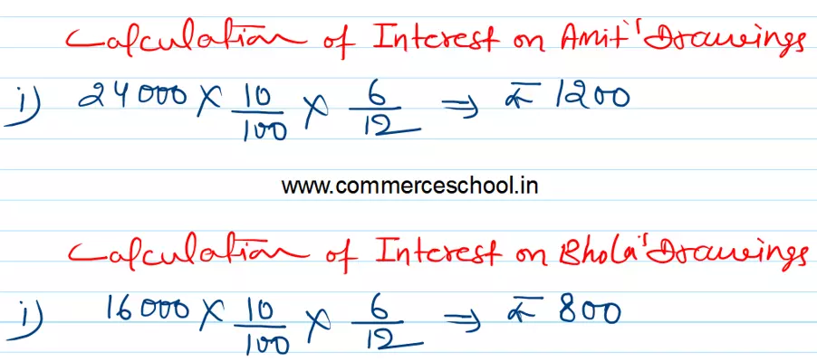 [Ans: Interest on Amit’s Drawings, ₹ 1,200 and Bhola’s ₹ 8,00]