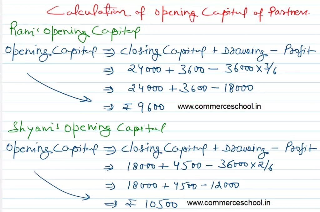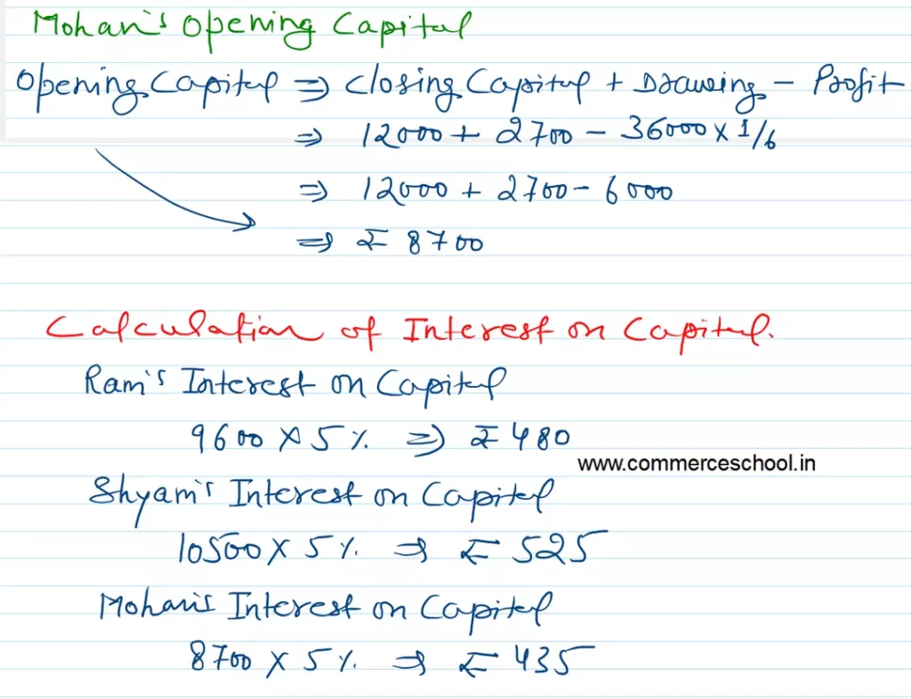 On March 31, 2017, after the close of books of accounts, the capital accounts of Ram, Shyam and Mohan showed balance of ₹ 24,000 ₹ 18,000 and ₹ 12,000 respectively. It was later discovered that interest on capital @ 5% had been omitted. The profit for the year ended March 31, 2017, amounted to ₹ 36,000 and the partner’s drawings had been Ram, ₹ 3,600; Shyam, ₹ 4,500 and Mohan, ₹ 2,700. The profit-sharing ratio of Ram, Shyam and Mohan was 3 : 2 : 1. Calculate interest on capital.