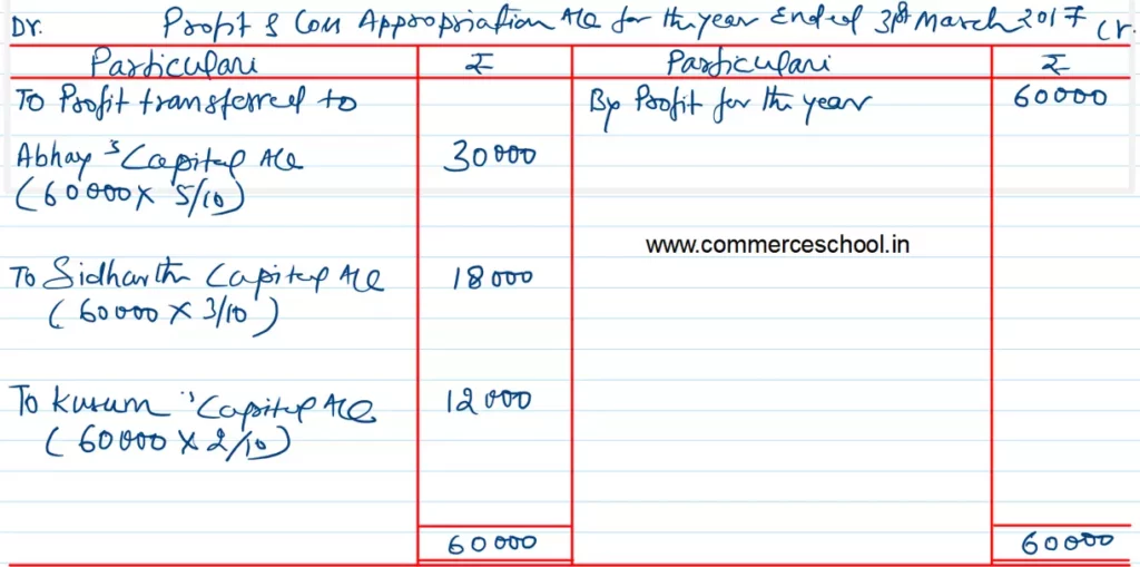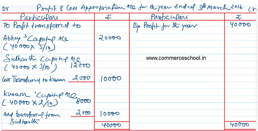Abhay, Siddharth and Kusum are partners in a firm, sharing profits in the ratio of 5 : 3 : 2. Kusum is guaranteed ₹ 10,000 as her share in the profits. Any deficiency arising on that account shall be met by Siddharth. Profits for the years ending March 31, 2016 and 2017 are ₹ 40,000 and 60,000 respectively. Prepare Profit and Loss Appropriation Account.