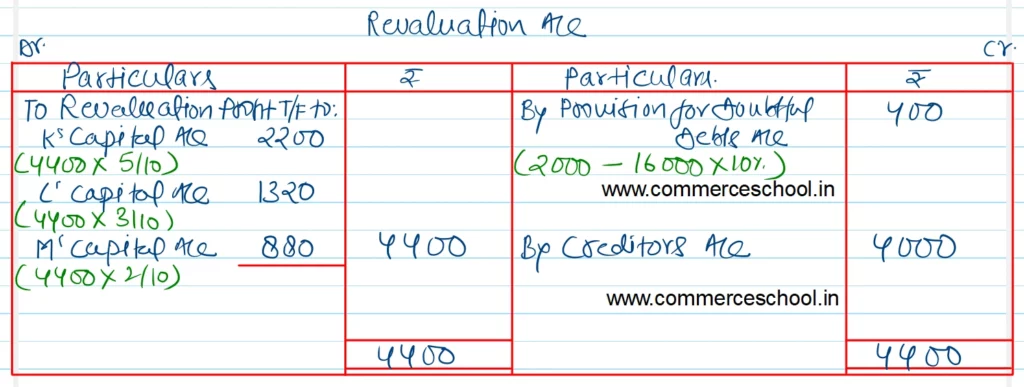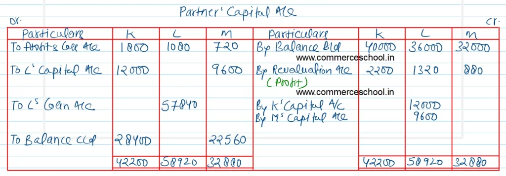 [Ans. Gain on Revaluation ₹ 4,400; L’s Loan A/c ₹ 57,840; Capitals K ₹ 28,400 and M ₹ 22,560; B/S Total ₹ 1,34,800.]