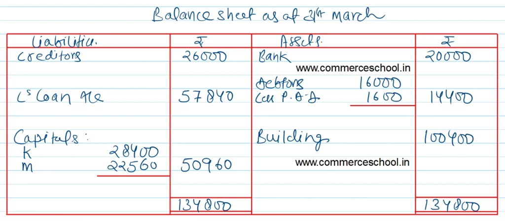 K, L and M were partners in a firm sharing profits in the ratio of 5 : 3 : 2. On 31.3.2021 the Balance Sheet of the firm was as follows: