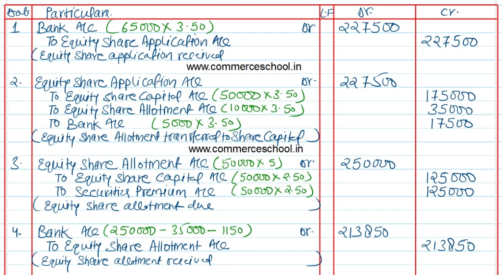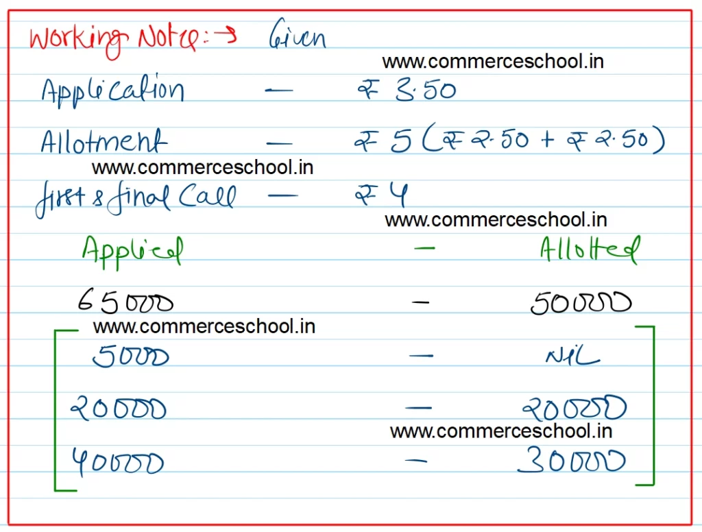 X Ltd. invited applications for 50,000 Equity Shares of ₹ 10 each, payable ₹ 3.50 on application; ₹ 5 on allotment (including premium ₹ 2.50); and ₹ 4 on first and final call.