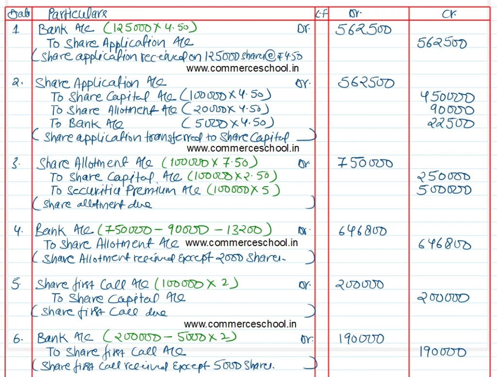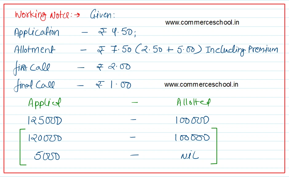 Applications were received for 1,25,000 shares and allotment was made pro-rata to the applicants of 1,20,000 shares, the remaining applications being refused. Money received in excess on the application was adjusted towards the amount due, on allotment.