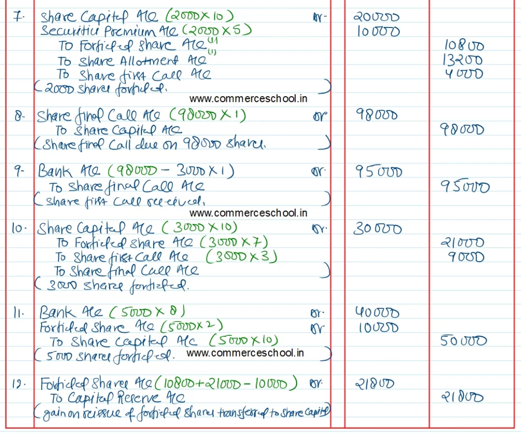 [Ans. cash at Bank ₹ 15,11,800; Cash received on allotment ₹ 6,46,800; Balance of Share Forfeiture A/c transferred to Capital Reserve ₹ 10,800 + ₹ 21,000 – ₹ 10,000 = ₹ 21,800.]