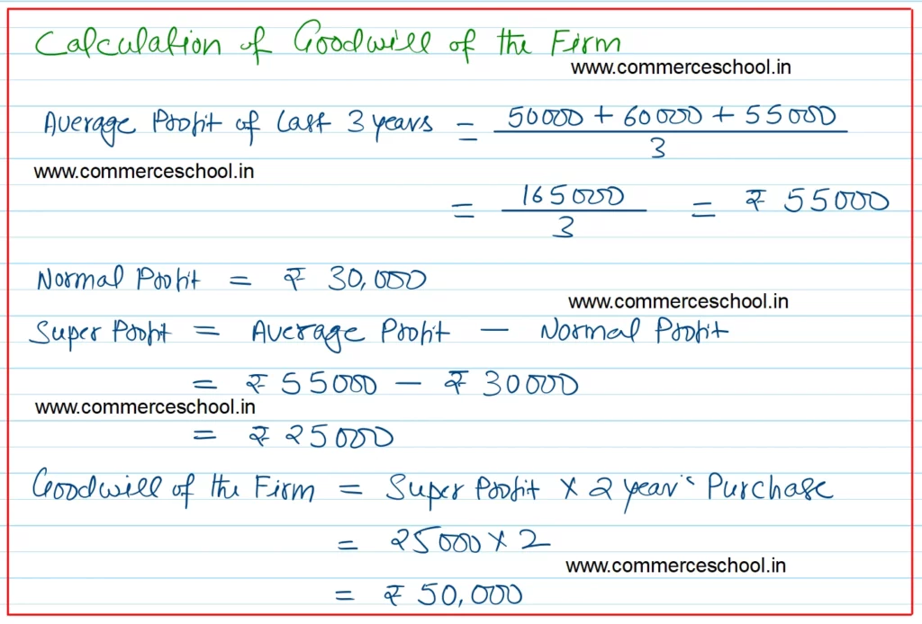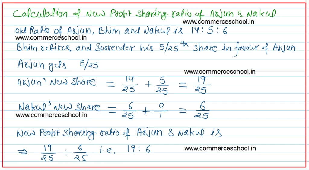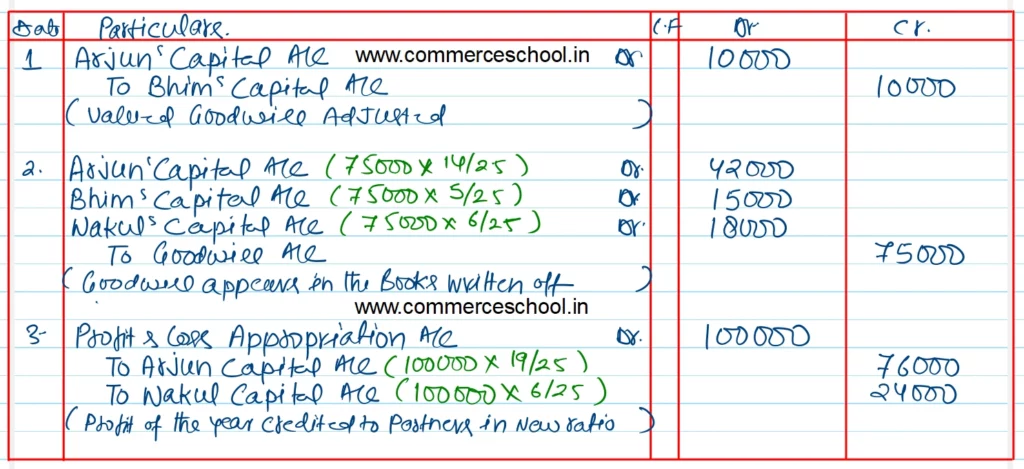 Q. 22. Arjun, Bhim and Nakul are partners sharing profits and losses in the ratio of 14 : 5 : 6 respectively. Bhim retires and surrenders his 5/25th shares in favour of Arjun. The goodwill of the firm is valued at 2 years purchase of super profits based on average profits of last 3 years. The profits for the last 3 years are ₹ 50,000, ₹ 60,000 and ₹ 55,000 respectively. The normal profits for the similar firm are ₹ 30,000. Goodwill aleardy appears in the books of the firm at ₹ 75,000. The profit for the first year after Bhim’s retirement was ₹ 1,00,000. Give the necessary journal entries to adjust Goodwill and to distribute profits showing your workings clearly.
