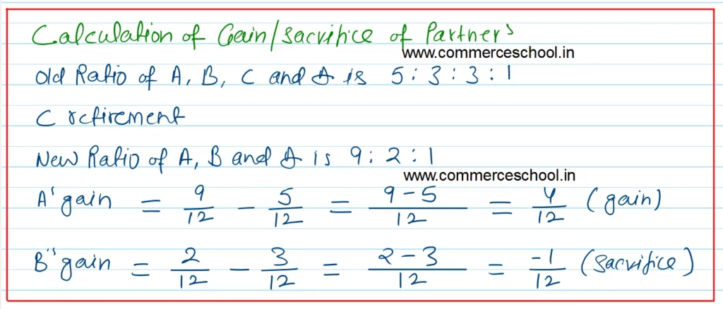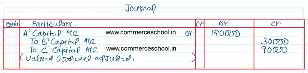 [Ans. Only A gains 4/12. B has also sacrificed 1/12. Hence A will be debited by ₹ 1,20,000 and B and C will be credited by ₹ 30,000 and ₹ 90,000 respectively.]