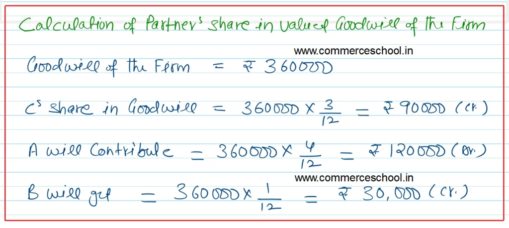 Q. 24. A, B, C and D are partners sharing profits in the ratio of 5 : 3 : 3 : 1. On the retirement of C, goodwill was valued at ₹ 3,60,000. C’s share of goodwill will be adjusted into the Capital accounts of A, B and D. Pass necessary entry for the treatment of goodwill when new profit sharing ratio is decided at 9 : 2 : 1.