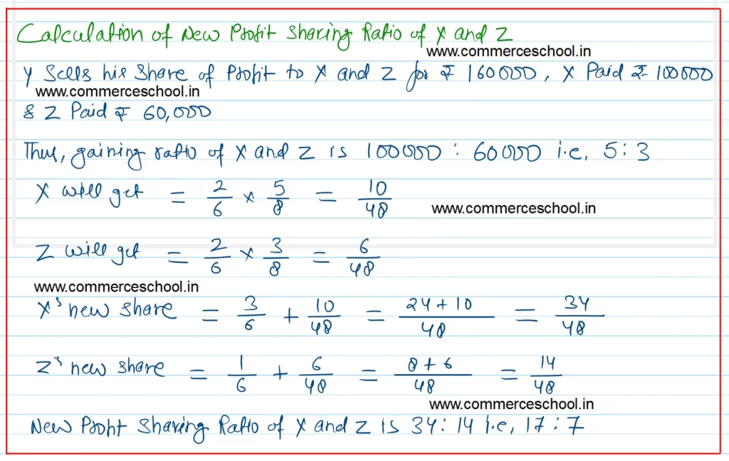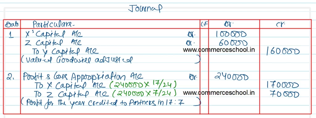 X, Y and Z are partners sharing profits and losses in the ratio of 3 : 2 : 1. Y retires selling his share to X and Z for ₹ 1,60,000, ₹ 1,00,000 being paid by X and ₹ 60,000 by Z. The profit for the year after Y’s retirement is ₹ 2,40,000.