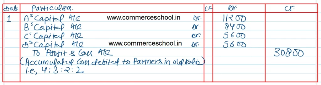 Q. 29. A, B, C and D are partners sharing profits in the ratio of 4 : 3 : 2 : 2. C retires and the remaining partners decided to share future profits in 5 : 3 : 2. on the date of C’s retirement there was a debit balance of ₹ 30,800 in the profit and loss account. Show the necessary journal entry for the treatment of profit and loss account balance.