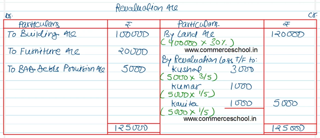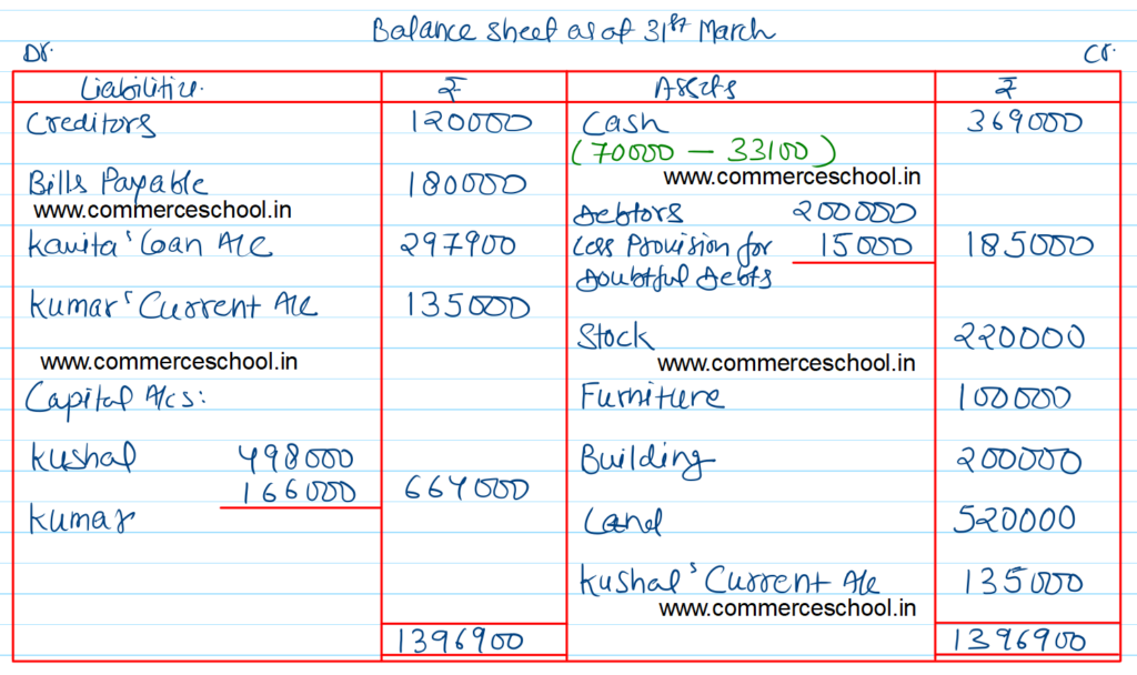 [Ans. Loss on Revaluation ₹ 5,000; Kavita’s Loan Account ₹ 2,97,900; Capital A/cs: Kushal ₹ 4,98,000; Kumar ₹ 1,66,000; Current A/cs: Kushal ₹ 1,35,000 (Dr.); Kumar ₹ 1,35,000 (Cr.); Balance Sheet Total ₹ 13,96,900.]
