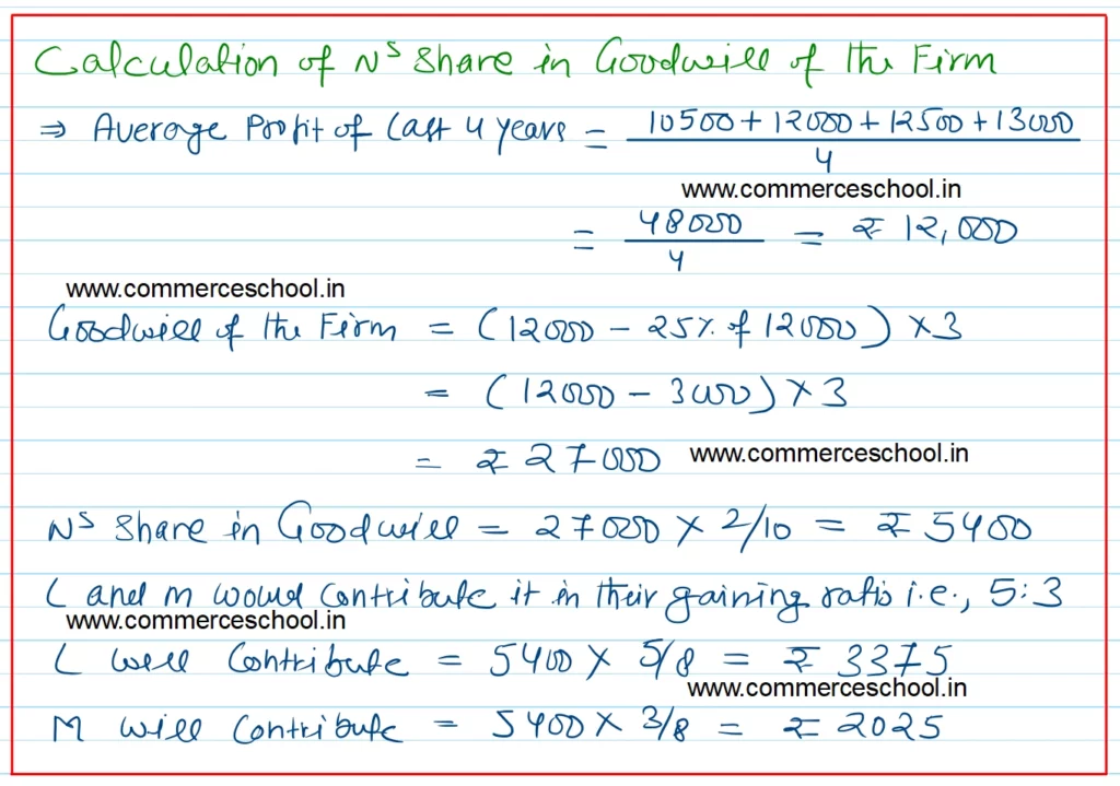 (d) Goodwill according to his share of profit to be calculated by taking thrice the amount of the average profit of the last four years less 25%. The profits of the previous years were: