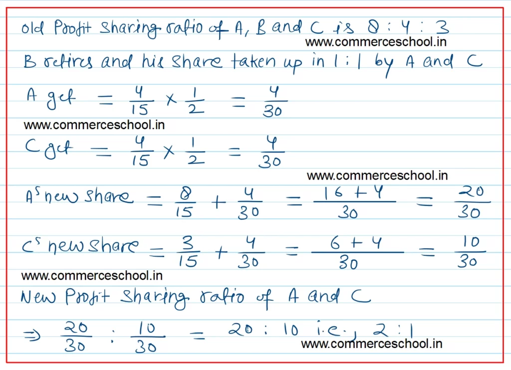 A, B and C were partners in a firm sharing profits in the ratio of 8 : 4 : 3. B retires and his share is taken up equally by A and C. Find the new profit sharing ratio.