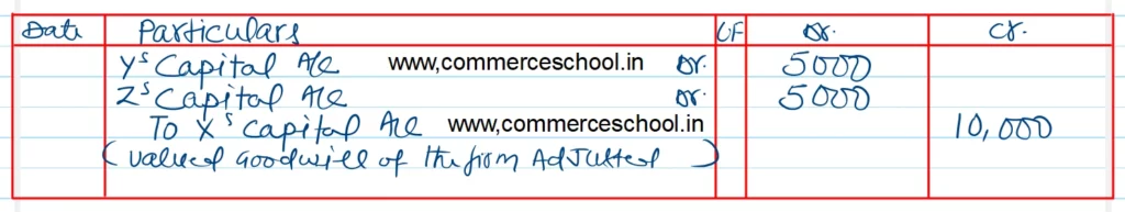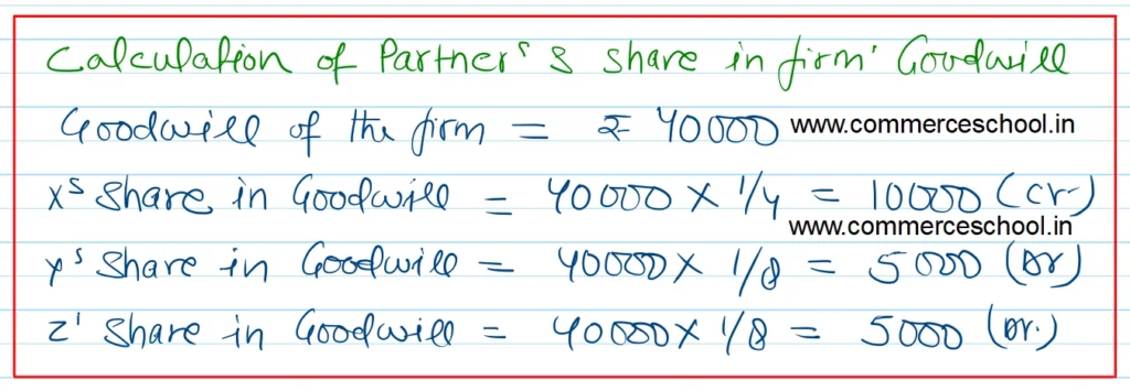 As from 1st April, 2023, it was agreed that X should give only part of time, to the business and that in consequence he should received in future only one half of his previous share, the remaining half being divided equally between Y and Z. The goodwill to be valued for this purpose, at ₹ 40,000.