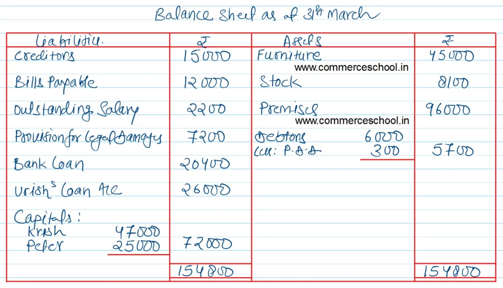 Krish, Vrish and Peter are partners sharing profits in the ratio of 3 : 2 : 1. Vrish retired from the firm. On that date the balance Sheet of the firm was as follows: