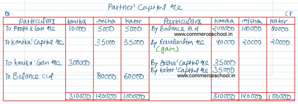 [Ans. Gain on Revaluation ₹ 80,000; Kanika’s Loan A/c ₹ 3,00,000; Capital A/cs Disha ₹ 80,000 and Kabir ₹ 60,000; B/S Total ₹ 5,40,000.]
